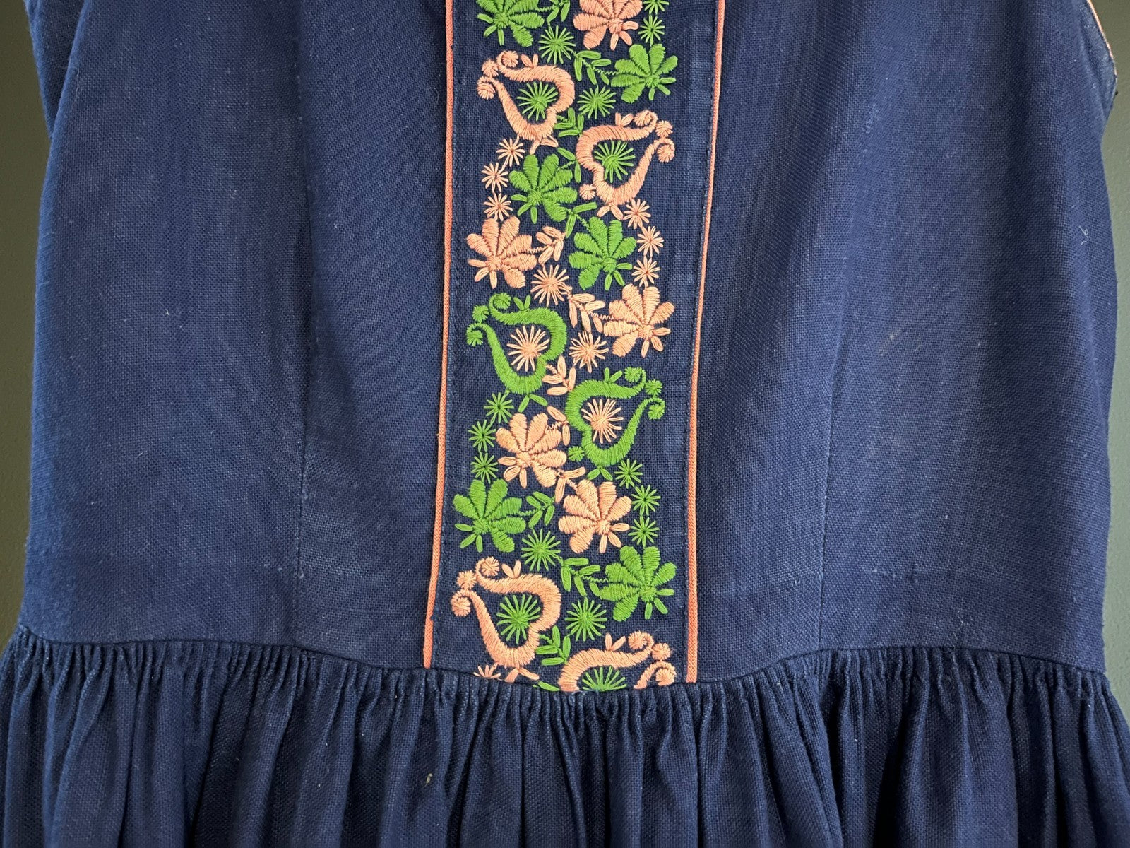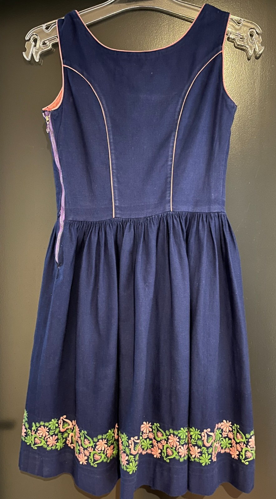 gebrauchtes Damen Trachten Dirndl ärmellosBlau mit Grün, Rosa Stickereiohne Schürzeohne Größenangabe, schätzungsweise Gr. 36 (s. Maße) einfache Brustweite: ca. 39 cmeinfache Taillenweite: ca. 33 cm