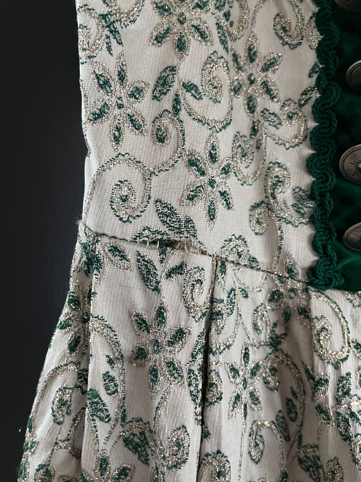 gebrauchtes Damen Trachten Dirndl ärmellosCreme, Grün, Gold gemustert mit Glitzerohne Schürzeca. Gr. 44 (s. Maße) einfache Brustweite: ca. 44 cmeinfache Taillenweite: ca. 40 cm