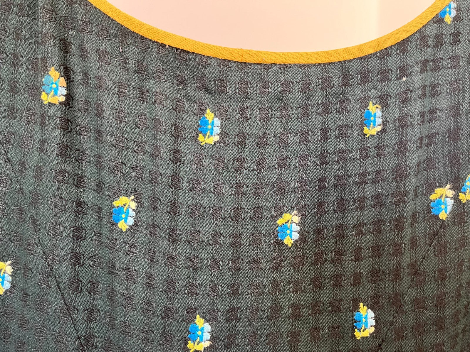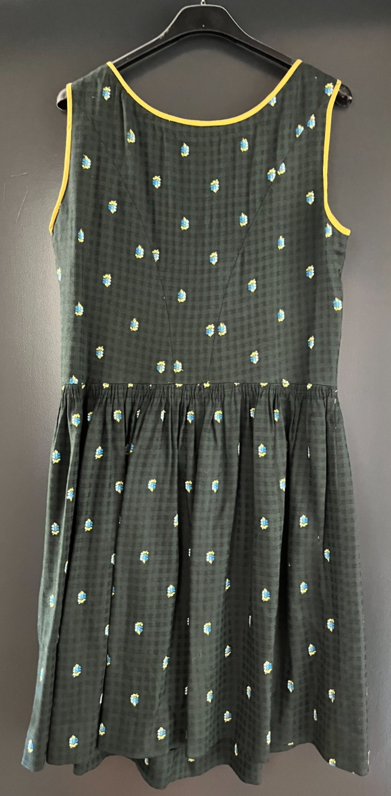 gebrauchtes Damen Trachten Dirndl ärmellosgrün, schwarz gemustert mit Stickereiohne Schürzeohne Größenangabe, schätzungsweise Gr. 40 (s. Maße)einfache Brustweite: ca. 46 cm