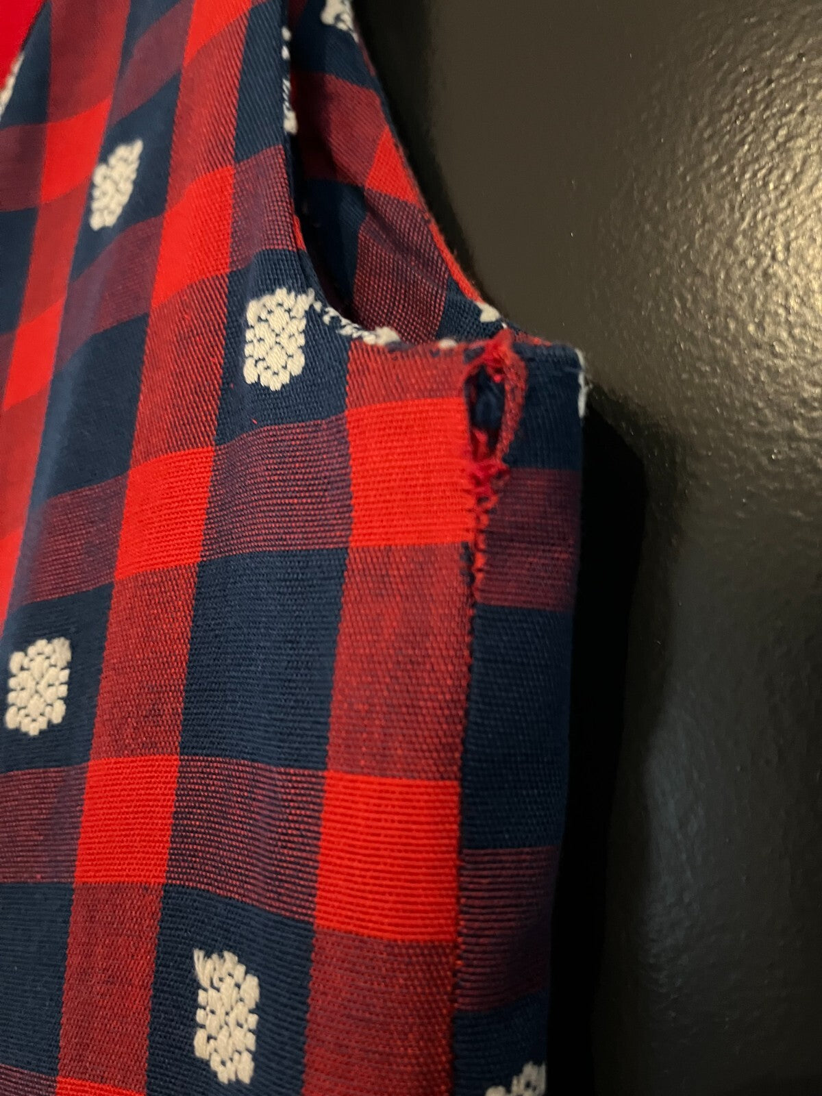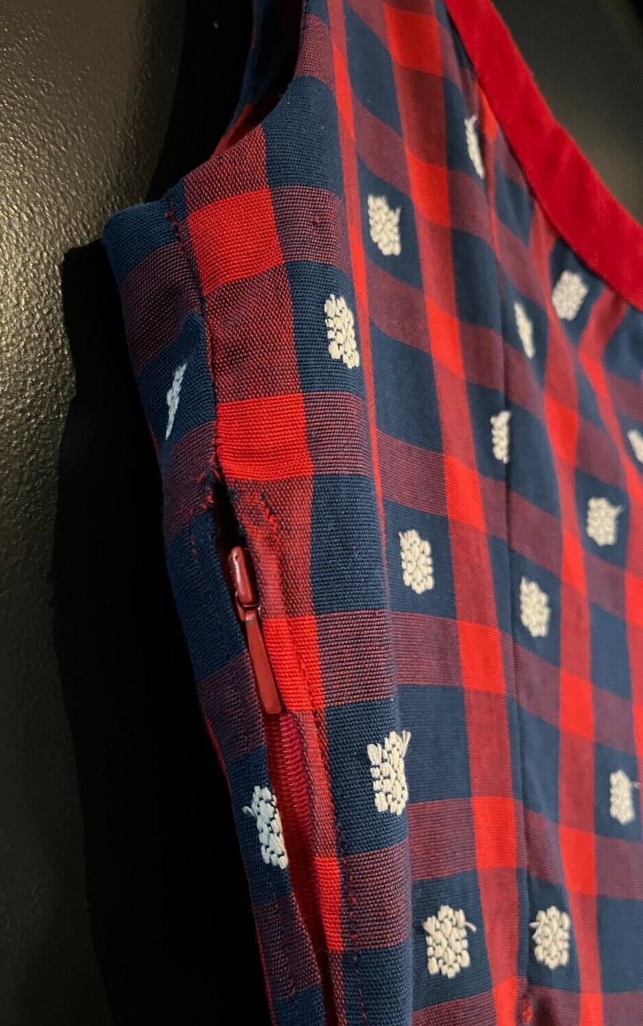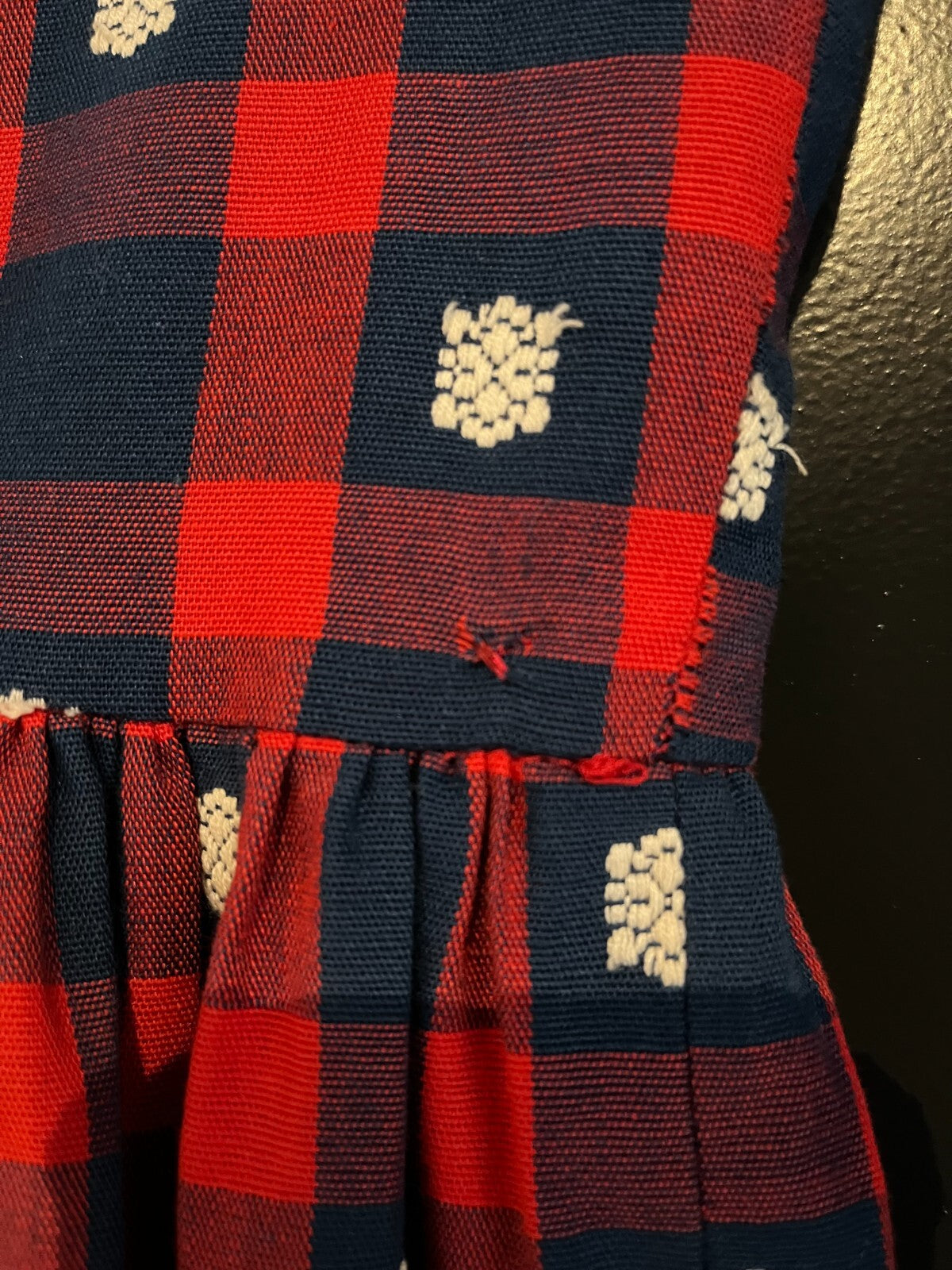 gebrauchtes Damen Trachten Dirndl ärmellosRot Blau gemustert mit weißer Stickerei v. Steinbockohne Schürze