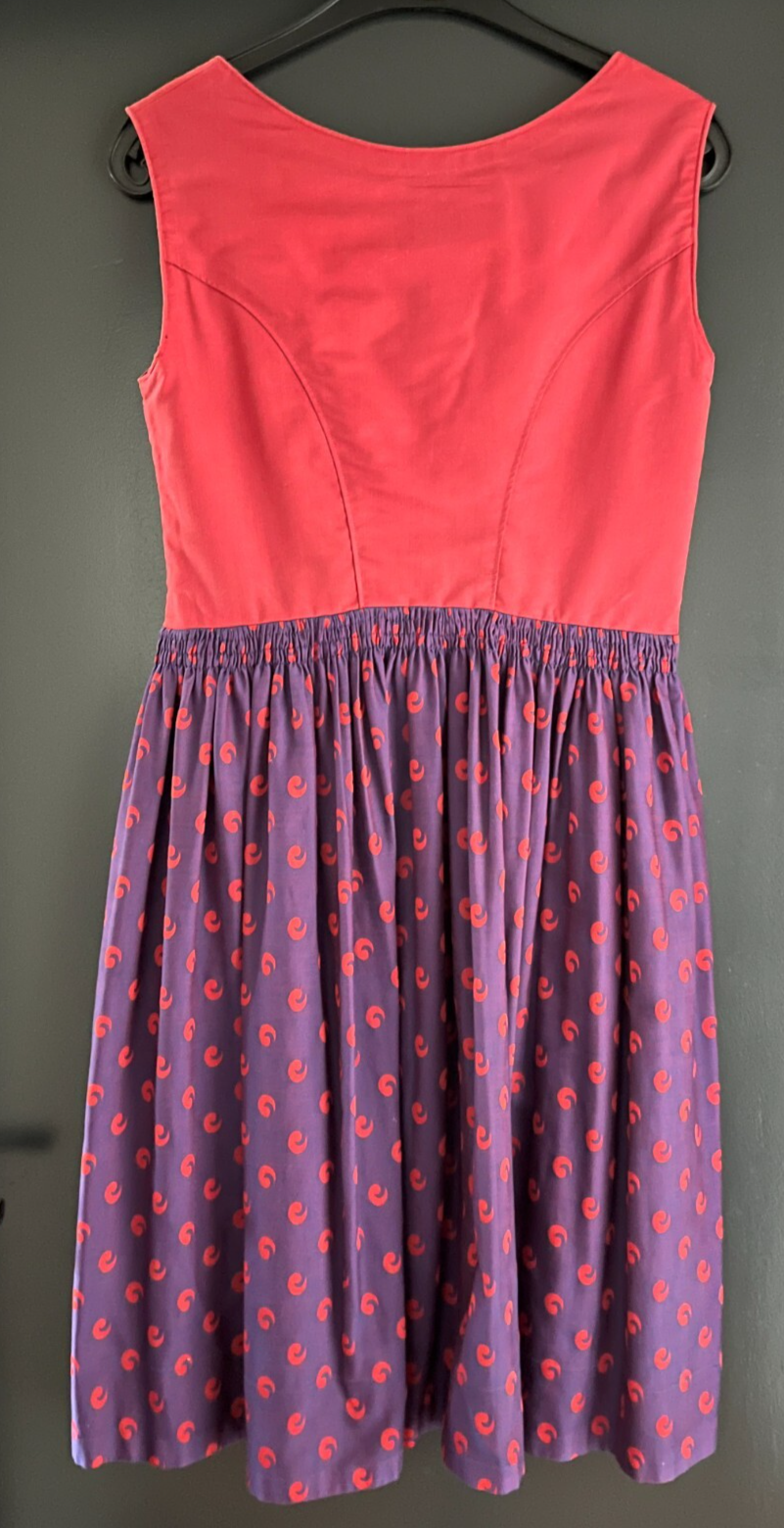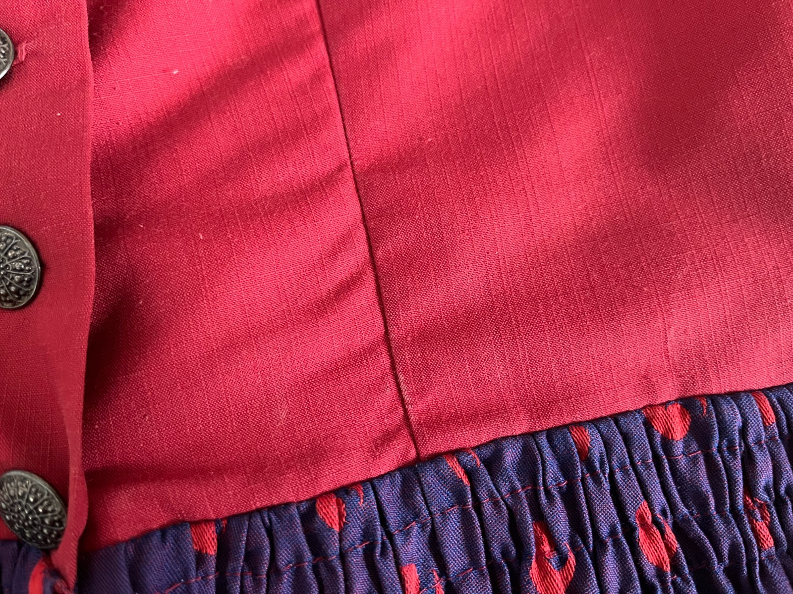 gebrauchtes Damen Trachten Dirndl ärmellosRot, Lila gemustertohne Schürzeohne Größenangabe, schätzungsweise ca. Gr. 38 (s. Maße)einfache Brustweite: ca. 42 cmeinfache Taillenweite: ca. 37 cm