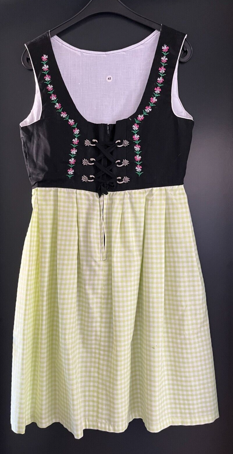 gebrauchtes Damen Trachten Dirndl ärmellosOberteil: Schwarz mit Blumenstickerei Rock: Grün, Weiß kariert ca. Gr. 42 (s. Maße) ohne Schürzeeinfache Brustweite: ca. 46 cmeinfache Taillenweite: ca. 40 cmGesamtlänge ab Schulter: ca. 99 cmMaterial: