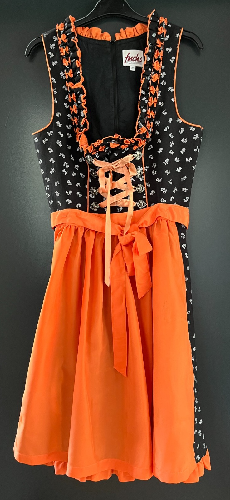 Damen Trachten Dirndl ärmellos schwarz orange mit Schürze Gr. 34 v. Fuchs