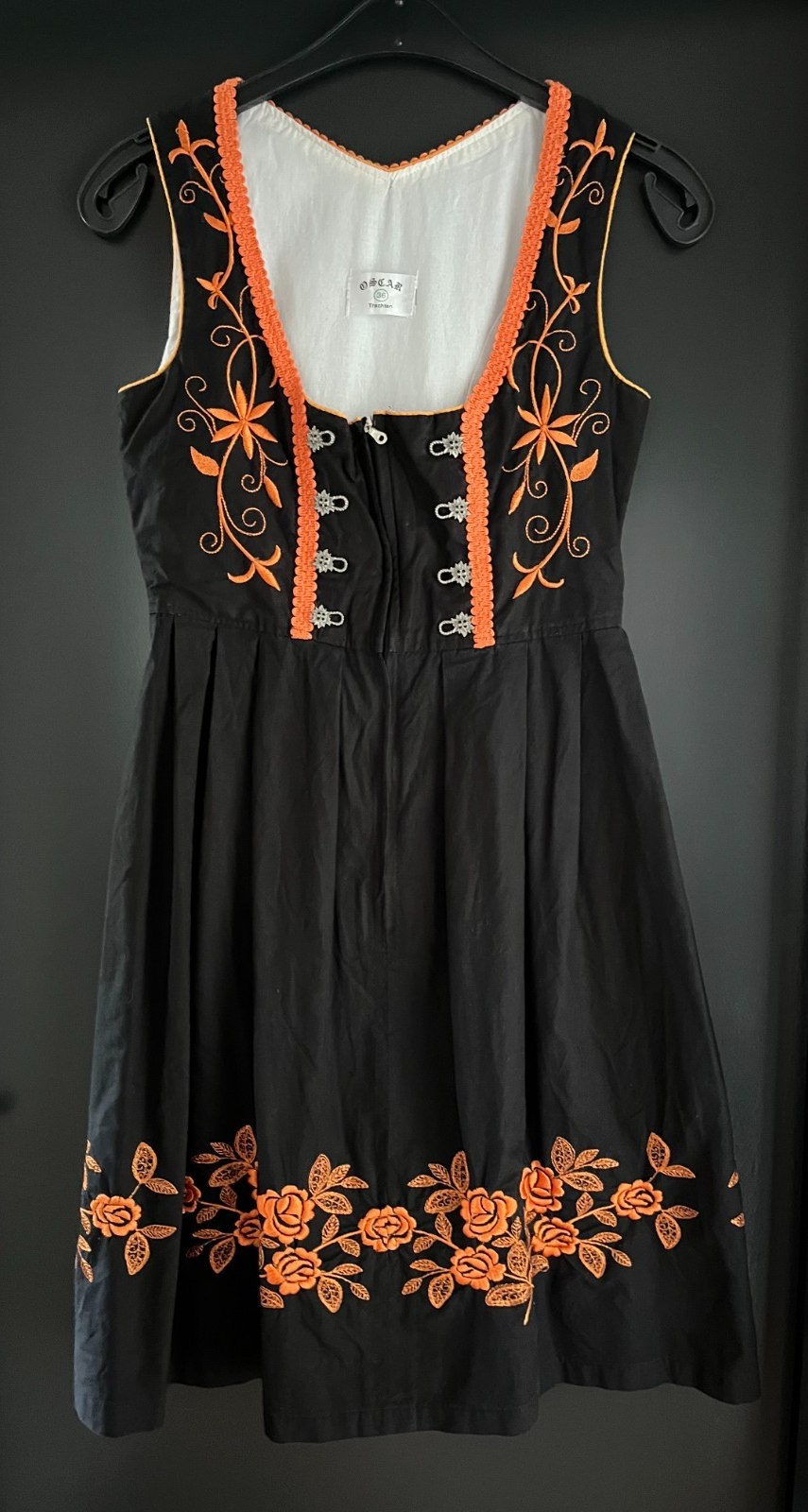 Damen Trachten Dirndl ärmellos Schwarz, Orange Stickerei ca. Gr. 36 v. Oscar