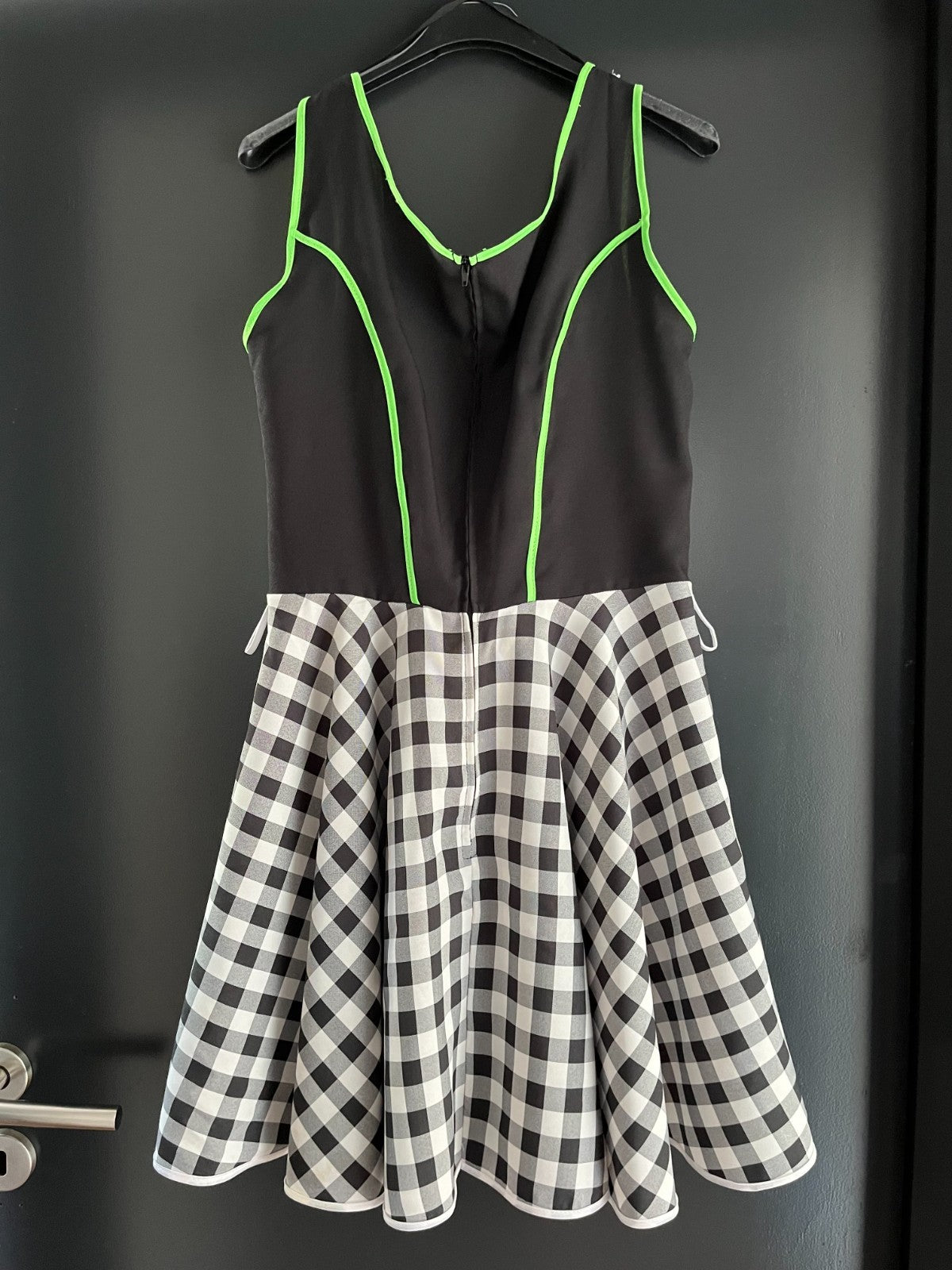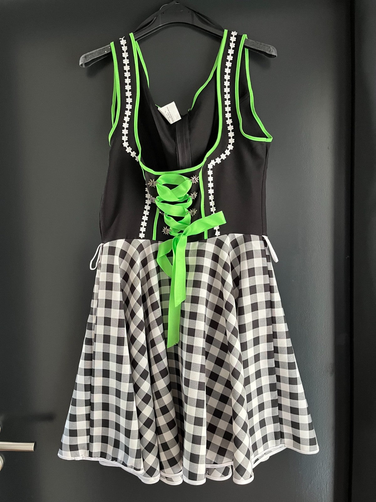 gebrauchtes Damen Trachten Dirndl ärmellosschwarz, weiß gemustert mit Neongrünohne SchürzeGr. 34 einfache Brustweite: ca. 46 cmeinfache Taillenweite: ca. 36 cm