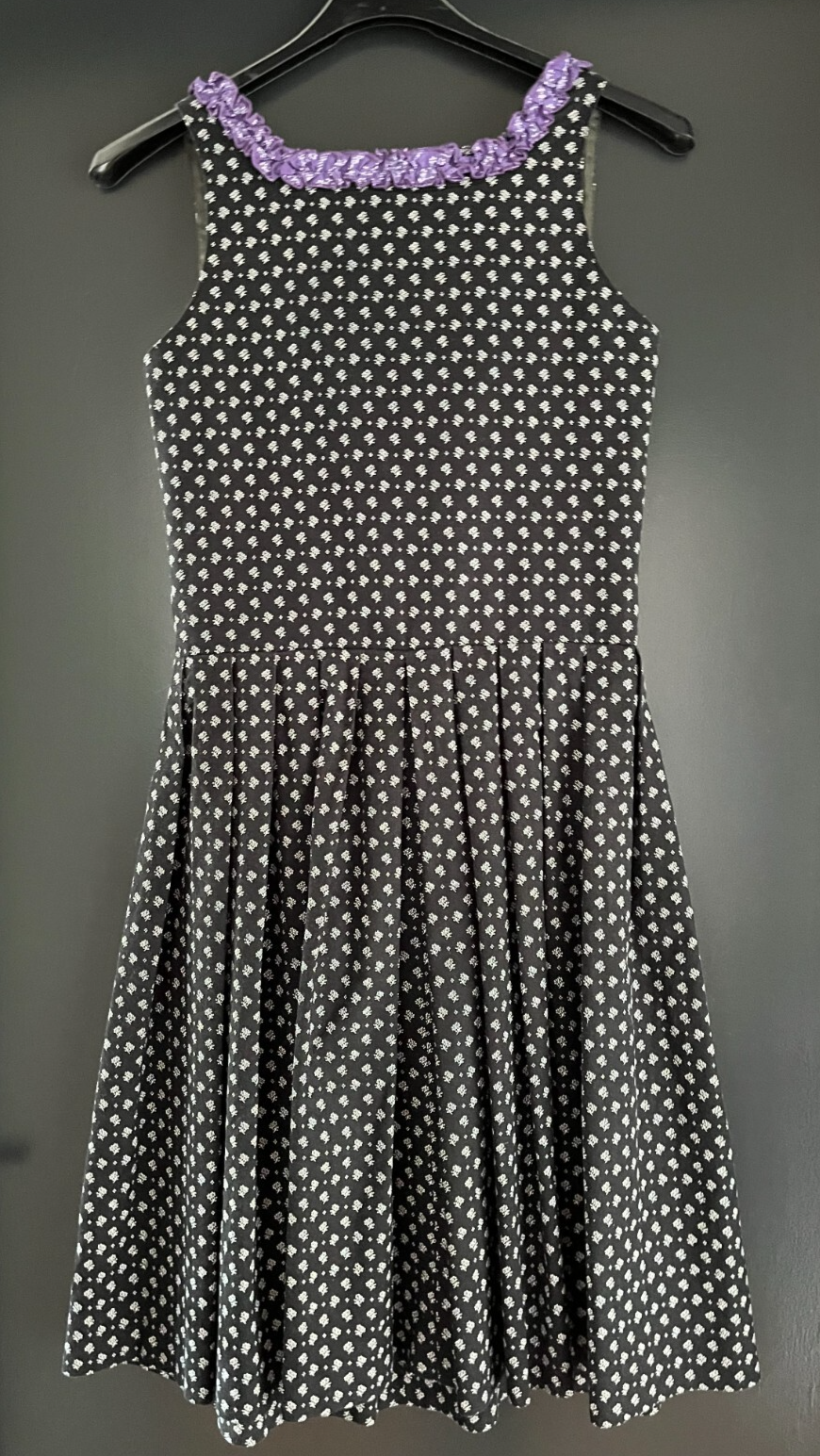 gebrauchtes Damen Trachten Dirndl ärmellosSchwarz-Weiß gemustert, Lilaohne SchürzeGr. 32 (s. Maße) einfache Brustweite: ca. 40 cmeinfache Taillenweite: ca. 34 cm