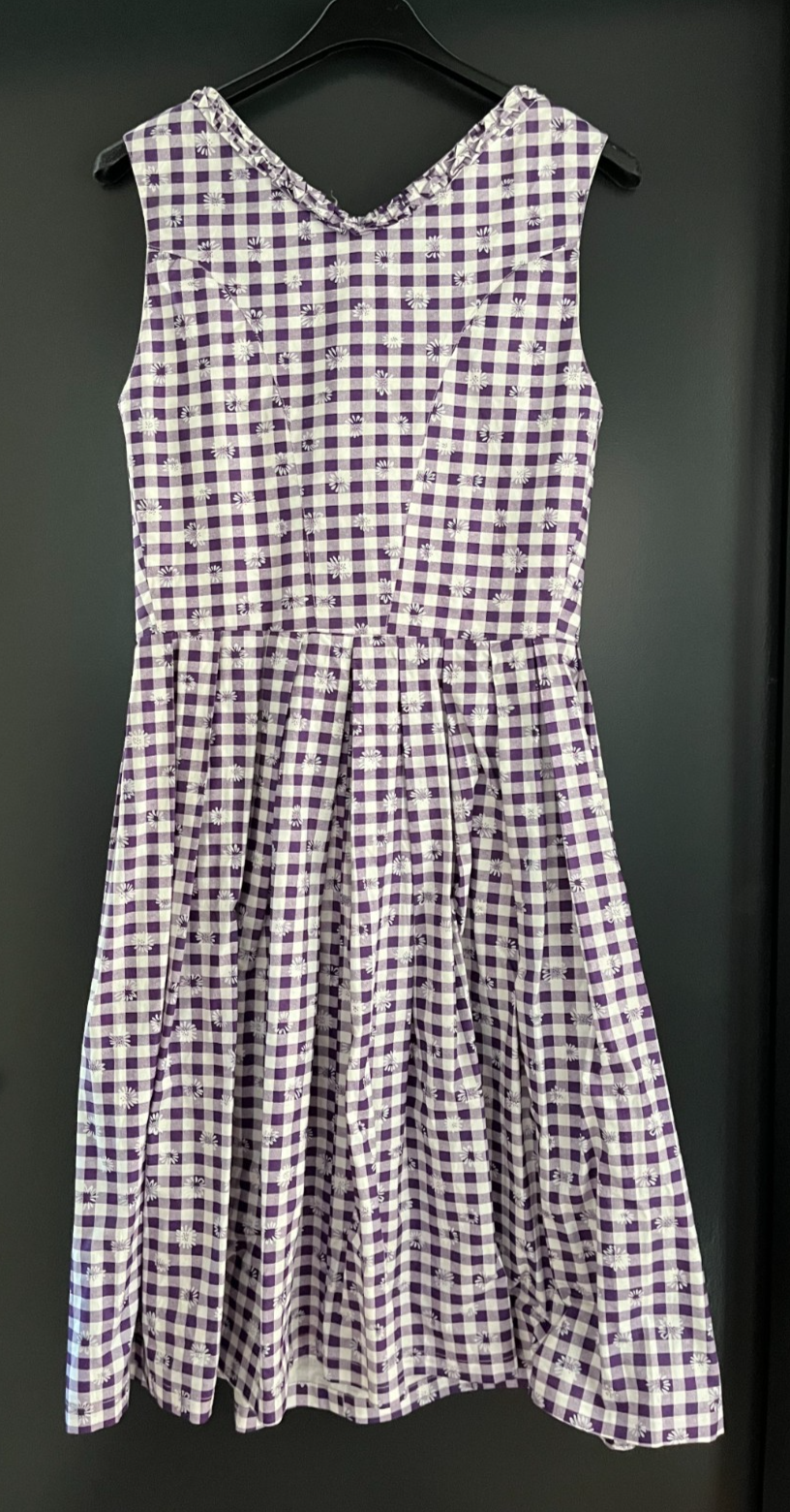 gebrauchtes Damen Trachten Dirndl ärmelloslila, weiß kariert mit Blumenmusterohne SchürzeGr. 38 (s. Maße) einfache Brustweite: ca. 40 cmeinfache Taillenweite: ca. 34 cm