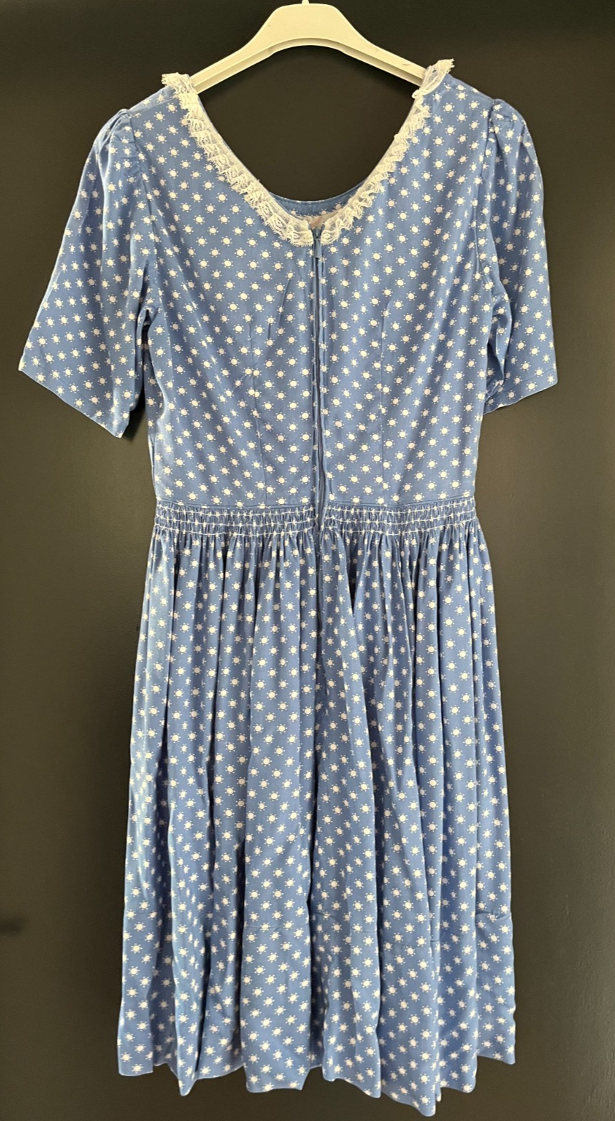 gebrauchtes Damen Trachten Dirndl/Kleid kurzarmHellblau, Weiß gemustertohne Schürzeohne Größenangabe, schätzungsweise ca. Gr. 34 (s. Maße) einfache Brustweite: ca. 40 cmeinfache Taillenweite: ca. 30 cm