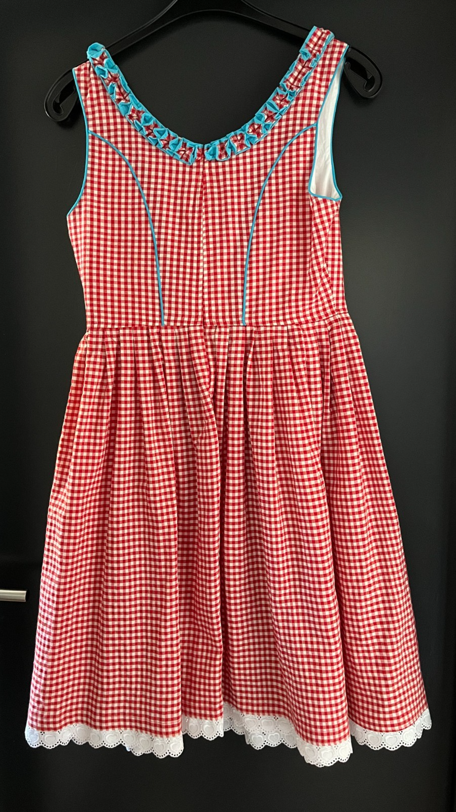 gebrauchtes Damen Trachten Dirndl ärmellosRot, weiß kariert, Hellblauohne Schürzeohne Größenangabe, schätzungsweise Gr. 38 (s. Maße) einfache Brustweite: ca. 45 cmeinfache Taillenweite: ca. 38 cm