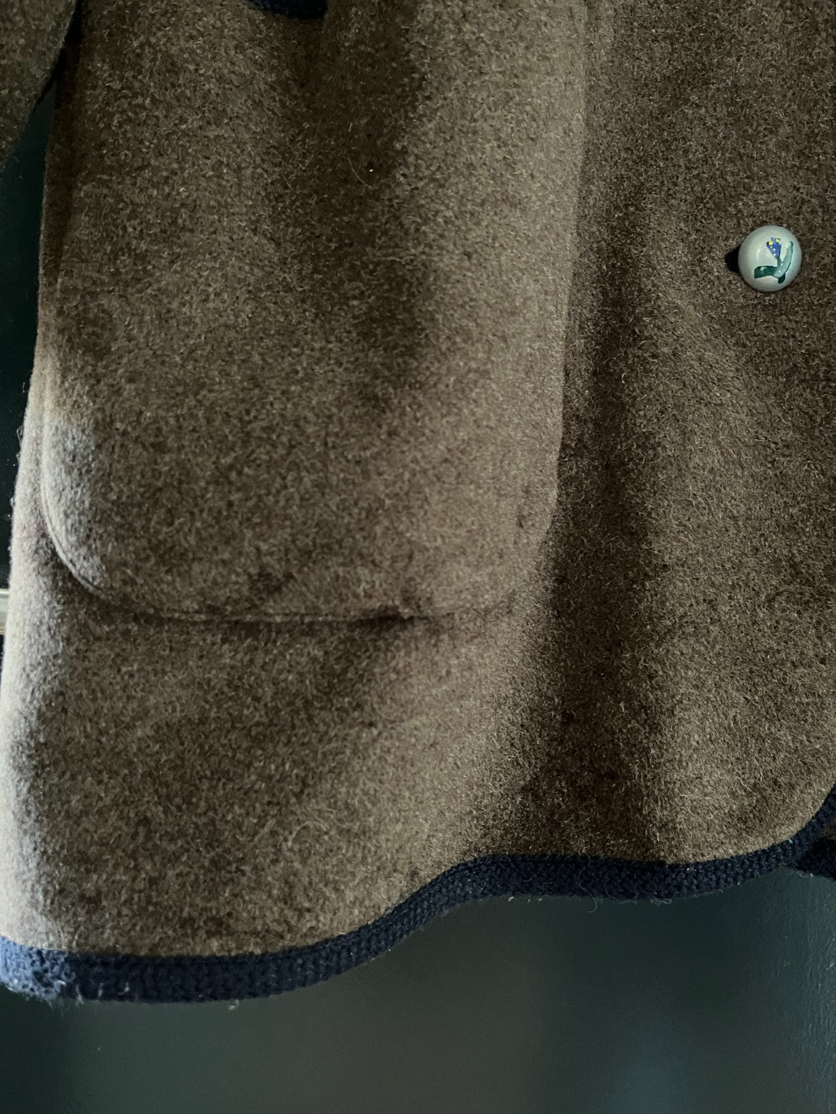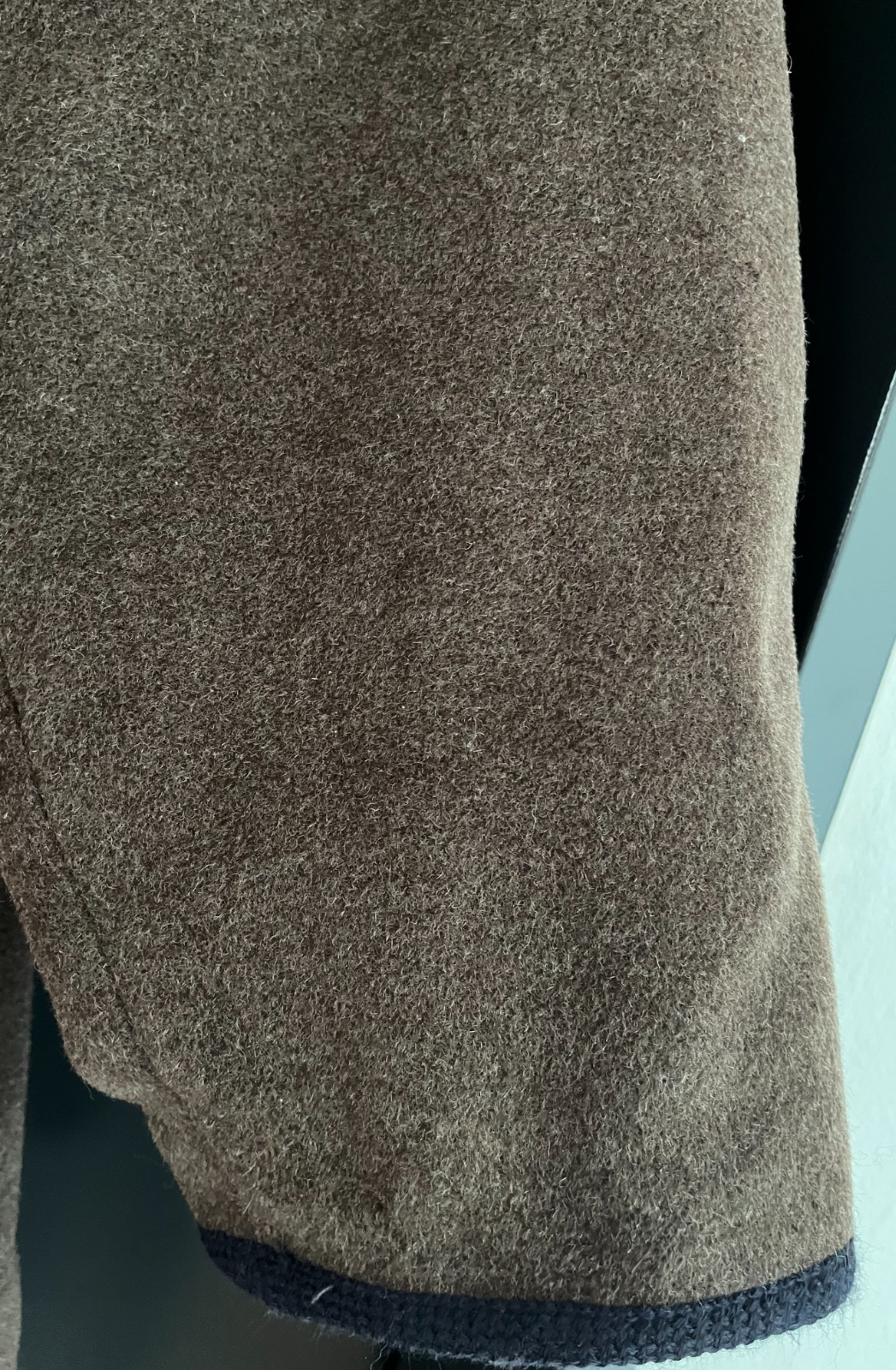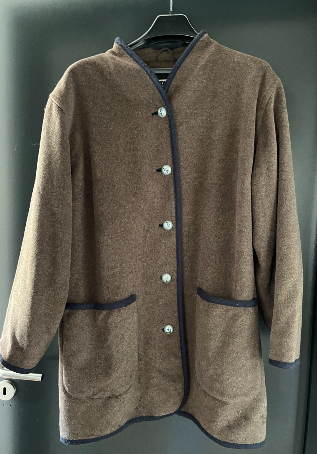 gebrauchter Damen Trachten Janker/JackeBraun, Blauca. Gr. 48 (s. Maße)Brustweite: ca. 68 cm Schulterweite: ca. 49 cmGesamtlänge ab Schulter: ca. 88 cmArmlänge ab Schulter: ca. 58 cm