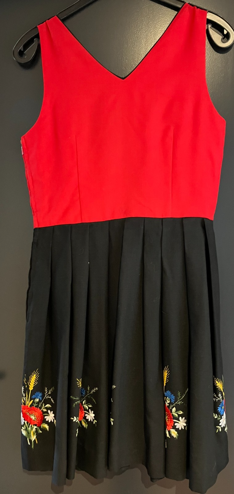 gebrauchtes Damen Trachten Dirndl ärmellosRot, Schwarz mit Stickereiohne Schürzeca. Gr. 40 (s. Maße) einfache Brustweite: ca. 44 cmeinfache Taillenweite: ca. 36 cm