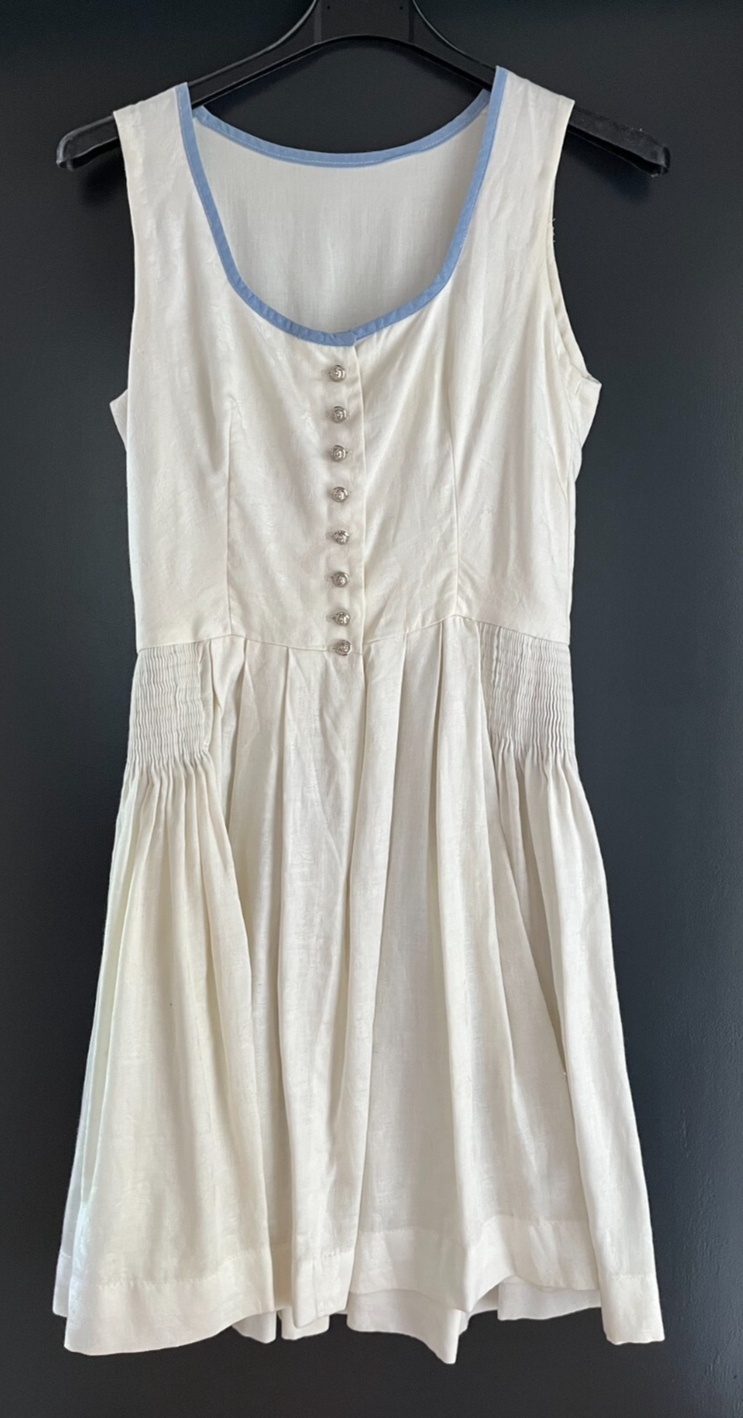 gebrauchtes Damen Trachten Dirndl ärmellosweiß, hellblauohne Schürzeohne Größenangabe, schätzungsweise ca. Gr. 34 einfache Brustweite: ca. 39,5 cmeinfache Taillenweite: ca. 32 cm