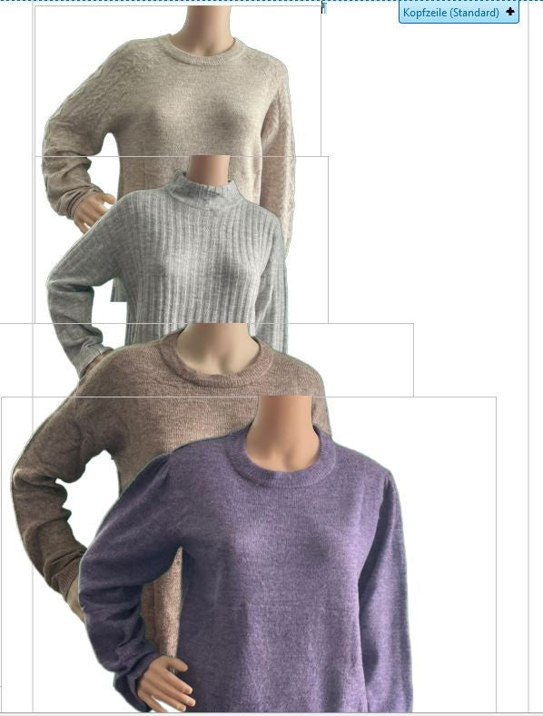 Erleben Sie stilvollen Komfort mit unserem Damenpullover in den ansprechenden Farben braun, beige, grau und blau. Dieser fein gestrickte Pullover mit langen Ärmeln fügt sich nahtlos in jede Garderobe ein. Gefertigt aus einer hochwertigen Mischung aus Acryl, Polyamid und Elasthan, verspricht er eine ideale Passform und leichte Pflege durch Maschinenwäsche. Ob im Büro oder beim entspannten Stadtbummel – dieser Pullover in den Größen S, M, L und XL bietet vielseitige Kombinationsmöglichkeiten und ist für jede Gelegenheit gerüstet.Jede Farbe ist eine andere Variante. Mal mit feinem Zopfmuster, ansprechender Rippstruktur, Rollkragen oder Rüschenbündchen - jedes Teil charmant. (Siehe Bilder)Bitte beachten Sie, dass durch das Fotografieren der Ware in einigen Fällen die Farbe von Bild zu Originalware leicht verändert sein kann.